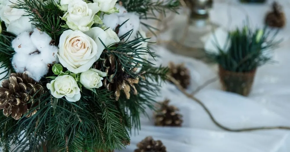 カラーは白・ゴールド・ディープグリーンを基調にすると冬らしい統一感が生まれます。花材はヒムロスギやコニファー、アマリリス、バラ、実物を組み合わせると温かみが出ます。キャンドルは防炎対応と転倒防止の器を選び、香りは食事の邪魔にならない控えめなタイプが無難です。